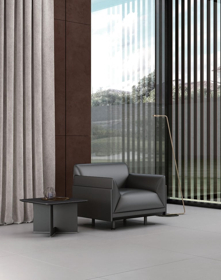 With simple outlines, the sofa and coffee table add a layered aesthetic feeling to a space. Their legs are treated with a metal paint and mixed with the textures of white oak and soft leather, creating a quality unique to the Metric series and reflecting a spirit of originality